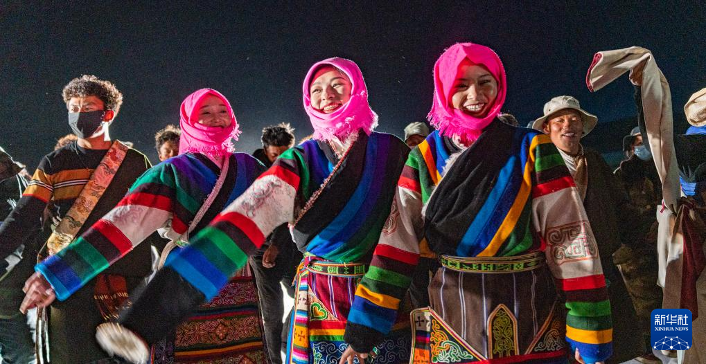 當(dāng)?shù)厝罕娫诩{木錯(cuò)開湖篝火晚會(huì)現(xiàn)場(chǎng)跳鍋莊(5月18日攝)。新華社記者 丁增尼達(dá) 攝