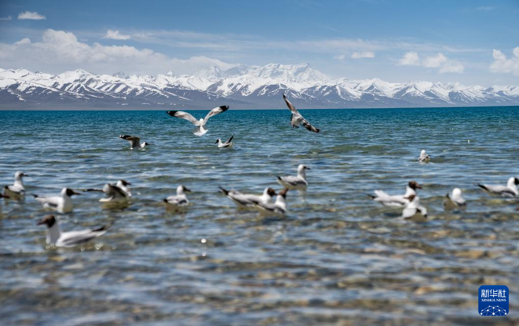 一群棕頭鷗在冰雪消融的納木錯(cuò)湖面停留(5月19日攝)。新華社記者 丁增尼達(dá) 攝