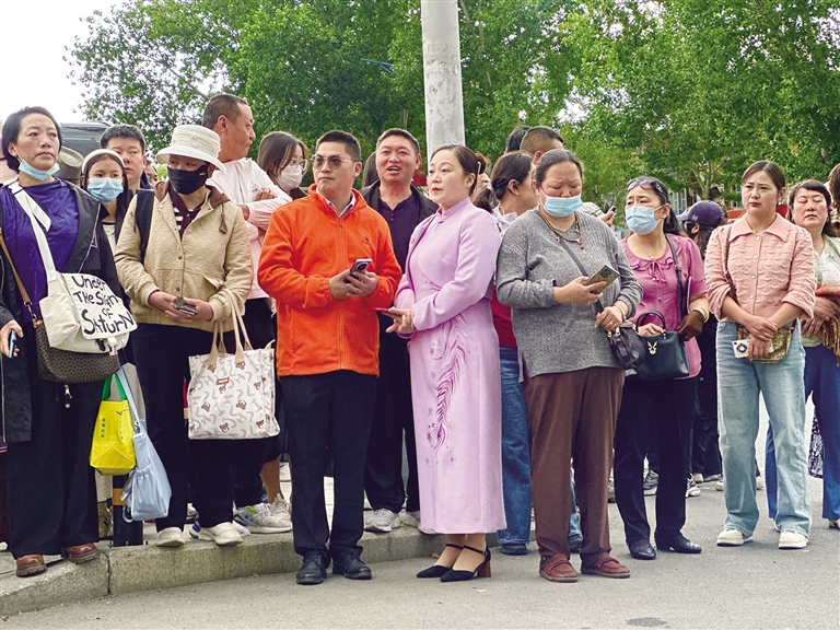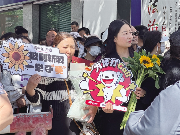 擊掌、擁抱……拉薩中學(xué)考點(diǎn)附近處處是為考生們加油的老師、家長。有些家長身著旗袍,有的老師手拿向日葵……給孩子加油打氣。