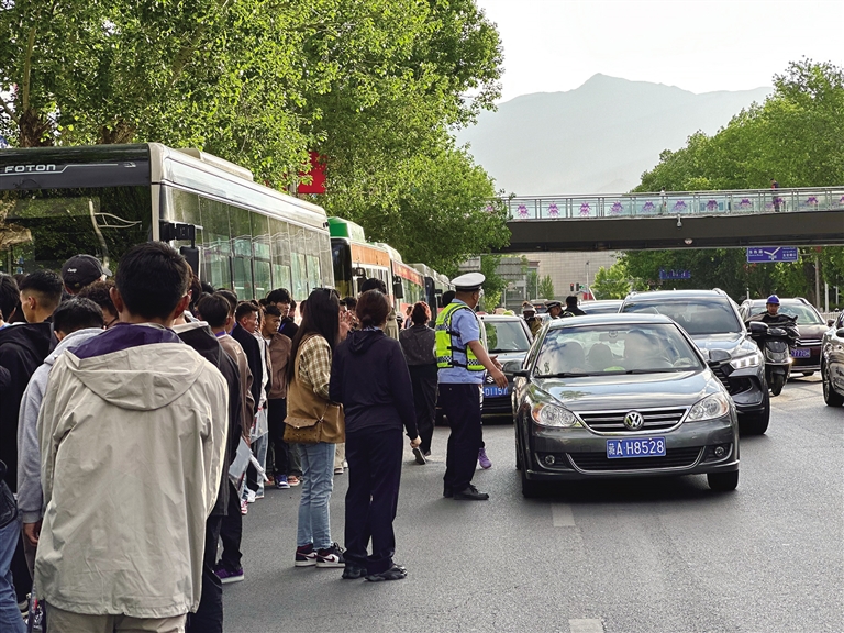 6月7日8點(diǎn),太陽剛剛升起,拉薩中學(xué)考點(diǎn)附近人頭攢動(dòng)。一輛輛愛心送考的公交車依次??吭隈R路邊,學(xué)生們排隊(duì)等候安檢進(jìn)場,考點(diǎn)大門口的喇叭重復(fù)播放著考生進(jìn)考場的溫馨提示。
