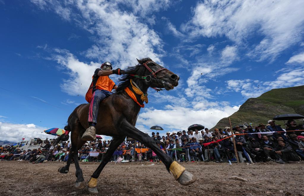 23日,在拉薩林周縣甘旦曲果鎮(zhèn)江角村的賽馬場(chǎng)上,選手邊瑪益丹穿著輕便的馬術(shù)運(yùn)動(dòng)服,上身貼緊棕色馬背,右手的馬鞭在空中打著旋,和他的愛馬進(jìn)行最后沖刺。