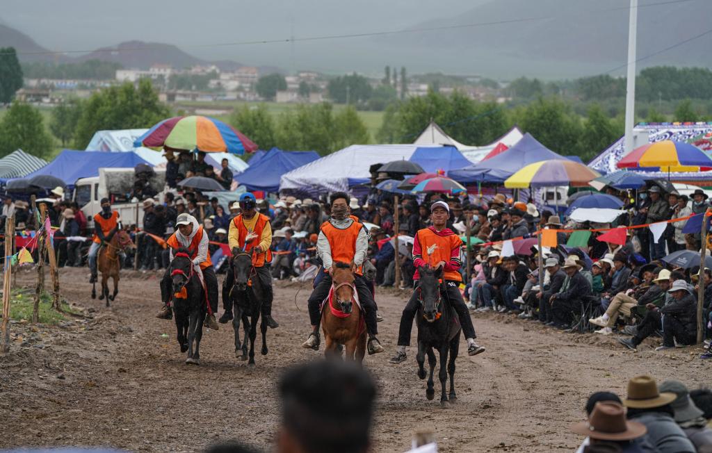 當(dāng)日比賽中,上百名選手根據(jù)參賽馬匹的年齡被分入不同的組別。邊瑪益丹在5歲及以上的“大馬”組比賽中奪冠。他和他的賽馬來(lái)自那曲市嘉黎縣,這是他第二次參加林周縣的賽馬比賽?!耙灿泻芏嗳说轿覀兡抢锶⒓淤愸R比賽,我們牧區(qū)之間常常有賽馬交流?!彼f。