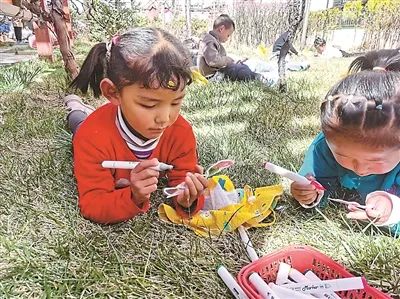 西藏自治區(qū)拉薩市城關區(qū)第十幼兒園幼兒在戶外創(chuàng)作美術作品。均為西藏自治區(qū)教育廳供圖