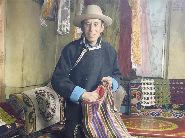 放牧巡邊途中的經(jīng)歷,格桑覺得只是日常的事情,并沒有什么值得講述的。不過,他也有特別珍視的東西。格桑特意走進(jìn)另一間屋子,捧出一個(gè)略顯舊色的布袋。他小心打開袋子,里面是他珍藏的一面面國旗。