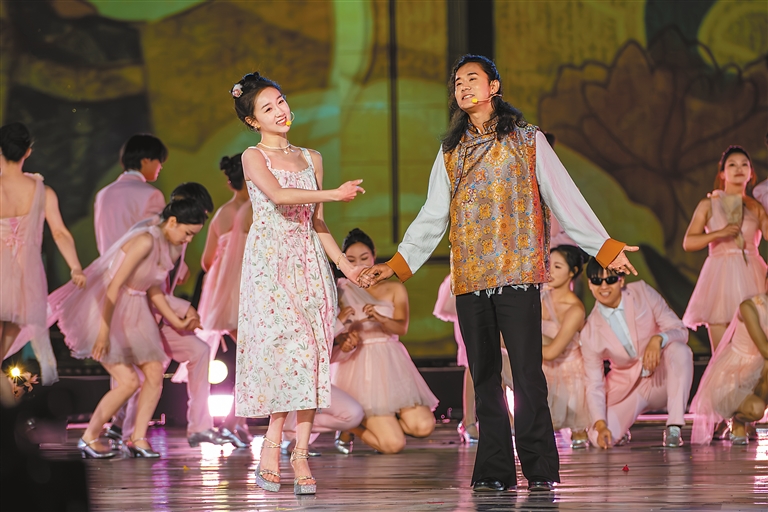 湖南民謠樂隊(duì)與山南搖滾樂隊(duì)帶來全新創(chuàng)作歌曲《雅礱歡歌》。這首歌以湖南童謠《月亮粑粑》和山南童謠為創(chuàng)作基底,兩支青春樂隊(duì)與山南職高的15名吉他手共同奏響青春樂章,“融”出別樣精彩。開幕式晚會(huì)將《次仁拉索》和《今天你要嫁給我》進(jìn)行了巧妙的“嫁接”,講述了各民族在交往交流交融中涌現(xiàn)出的愛情故事。
