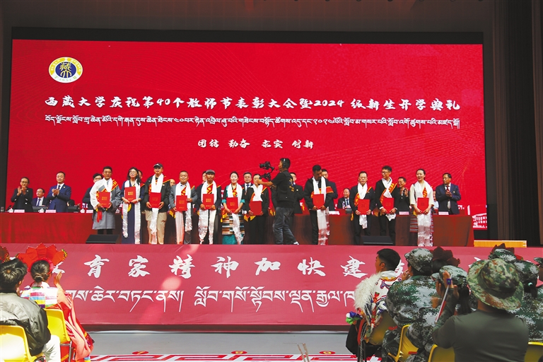 10日下午,西藏大學在納金校區(qū)雙創(chuàng)活動中心舉辦第40個教師節(jié)表彰大會暨2024級新生開學典禮?;顒釉跓崆闅g快的暖場歌舞中拉開帷幕,會場內紅旗飄揚,氣氛熱烈而莊重,全體2024級新生、學校各單位主要負責人、受表彰師生代表等共計3300余師生齊聚一堂,共同見證這一重要時刻。