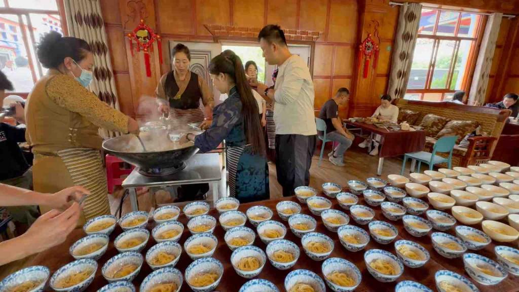 “目前店里紀(jì)錄保持在147碗?!痹诩{西民族鄉(xiāng)經(jīng)營(yíng)果拉叢農(nóng)家樂(lè)的果拉卓瑪說(shuō),“但生活再好也不能浪費(fèi)。我們會(huì)提醒客人,如果吃飽了,只需用筷子在碗上搭出尖尖,就會(huì)停止加面;但對(duì)于不搭筷子的客人,我們還會(huì)再勸一碗?!?/p>