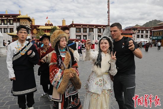 9月2日,西藏拉薩市八廓街,來自俄羅斯的巴德里(右一)與身穿藏族傳統(tǒng)服裝的年輕游客合影留念。近年來,來拉薩旅游,到八廓街、布達拉宮廣場拍一套藏服寫真,已經(jīng)成為進藏旅游年輕人的“標(biāo)配”。中青報·中青網(wǎng)記者 孔斯琪/攝