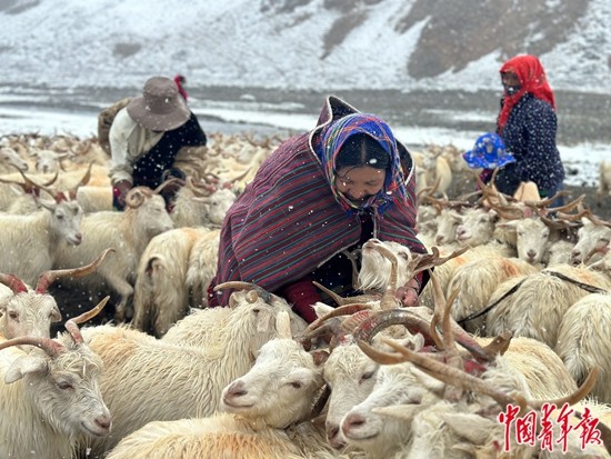 9月13日,西藏阿里地區(qū)日土縣熱幫鄉(xiāng)龍門卡村迎來了一場雪。在海拔近4800米的龍門卡村夏季牧場,牧民們把待擠奶的白絨山羊依次用繩子拴起來。中青報·中青網(wǎng)記者 石佳/攝