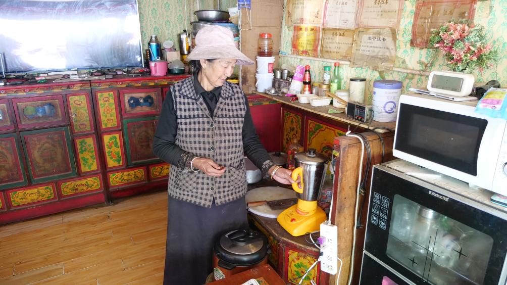 對瓊國來說,生活中變化極大的就是生產(chǎn)酥油。“用電動酥油機(jī),一桶奶幾分鐘就能打完,太省事了!”瓊國家的冰箱里如今常備著二十幾斤酥油。電動酥油機(jī)“上崗”后,酥油桶就閑置了。