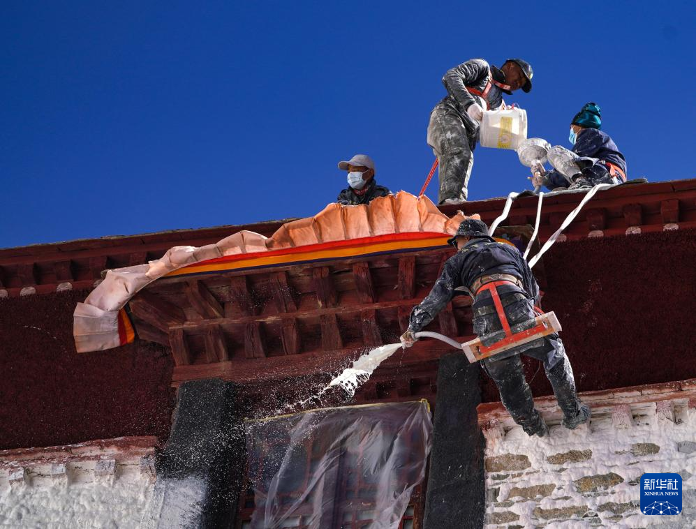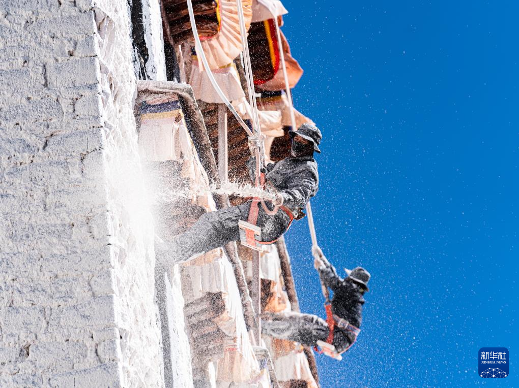 10月30日,布達拉宮管理處的工作人員在噴灑涂料。新華社記者 旦增尼瑪曲珠 攝