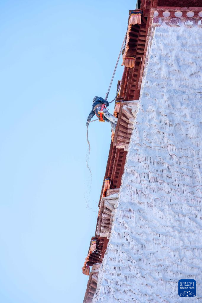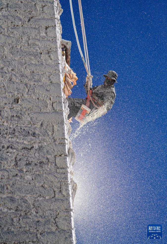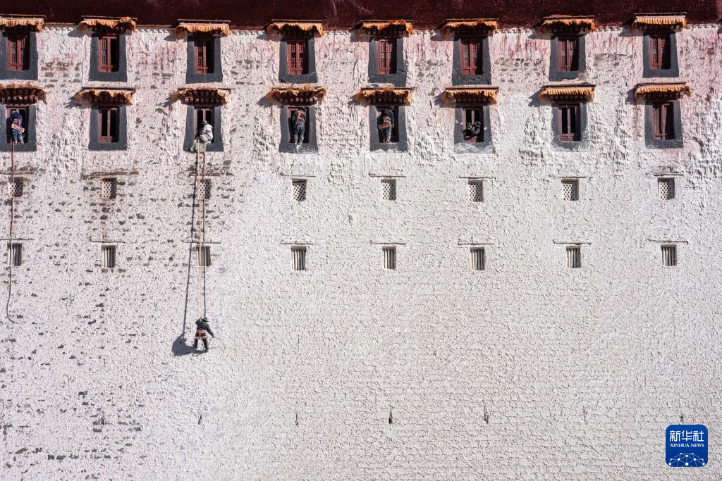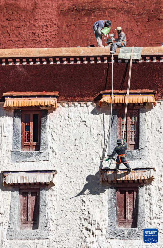 10月28日,布達拉宮管理處的工作人員在噴灑涂料。新華社記者 旦增尼瑪曲珠 攝