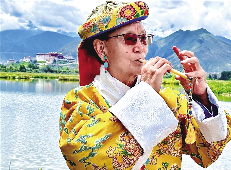 鷹笛是來自于大自然的樂器,吹奏出的每個(gè)音符蘊(yùn)含了大自然的靈性。笛聲如同在天空中任意翱翔的雄鷹,高亢且空靈,似乎在訴說著千年的傳奇。今年74歲的次旦,是國家一級演奏員,也是自治區(qū)級藏族鷹笛藝術(shù)非物質(zhì)文化遺產(chǎn)代表性傳承人。次旦老師從小和鷹笛結(jié)下了不解之緣,并立志要將藏族鷹笛藝術(shù)發(fā)揚(yáng)光大。如今,退休在家的次旦老師依舊奔忙在傳播藏族鷹笛藝術(shù)的工作中,為傳承“非遺”貢獻(xiàn)著自己的力量。