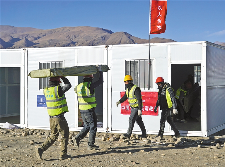 圖為1月10日,中交集團二航局二公司工作人員在拉孜縣為受災(zāi)群眾組裝活動板房。記者 薛瑩 王香香 索朗群培 攝