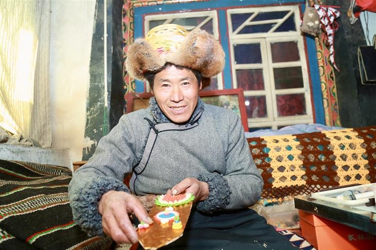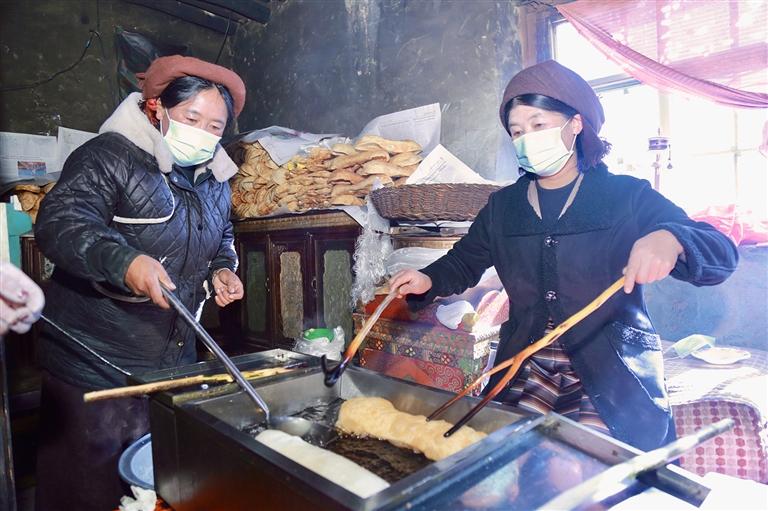 “德卡”,作為傳統(tǒng)藏式點心“卡塞”的一種,在藏歷新年的年貨清單里占據(jù)著不可或缺的位置。每到藏歷新年前夕,旦索朗一家便進(jìn)入了一年中最忙碌的時段——經(jīng)營起制作和售賣卡塞的生意。旦索朗回憶起小時候的新年,感慨萬分:“小時候過年,家家戶戶都自己炸卡塞,那時候,整個村子都被卡塞的濃香包圍著?,F(xiàn)在生活條件好了,很多人覺得在外購買德卡更方便省事,這也給我們帶來了商機(jī)。我們做炸德卡的生意已經(jīng)6年了,一直都很受歡迎,還帶動了6名村民一起參與,增加了大家的收入。”