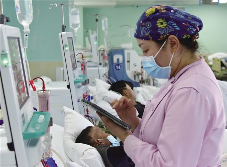 護士在調整透析參數。圖由自治區(qū)人民醫(yī)院提供