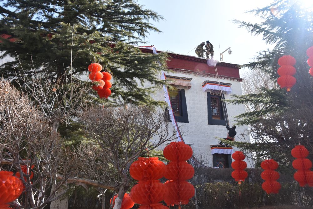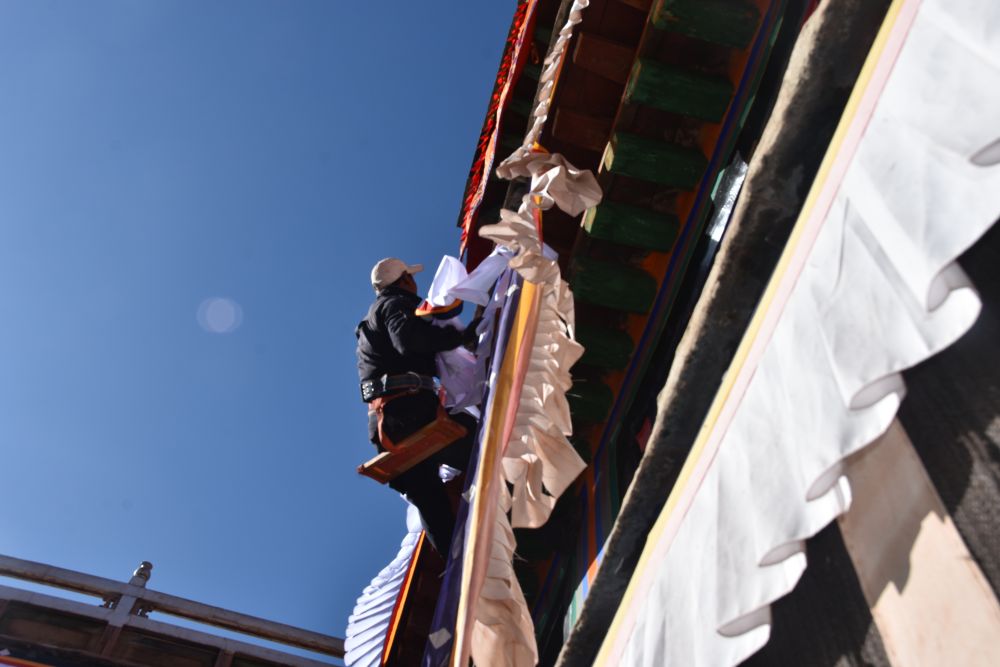 2月28日是藏歷木蛇新年。隨著春天的腳步將近,布達拉宮迎來這場特別的“換裝”儀式——更換“香布”。“香布”是藏式建筑的裝飾,通常用五彩棉布縫制,主體為白色,搭配紅藍黃等色的邊沿,對窗沿等的顏料及木構件起到保護作用。