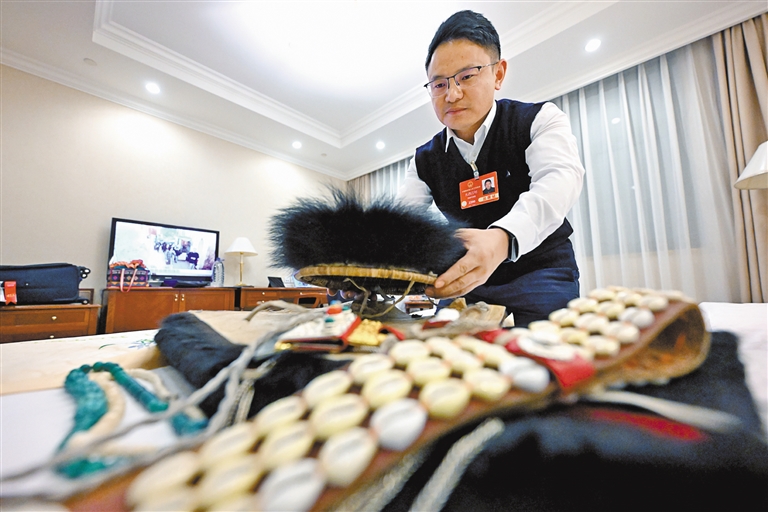 全國人大代表扎西江村在準(zhǔn)備參會(huì)時(shí)穿的民族服飾。