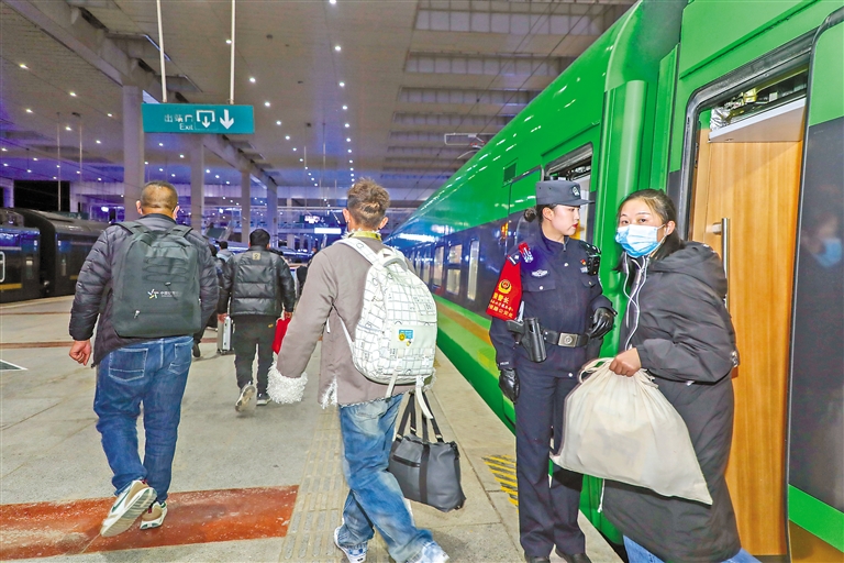 “格桑梅朵”女子乘務(wù)組乘警引導(dǎo)旅客平安下車。記者 劉斯宇 通訊員 黃飛 攝
