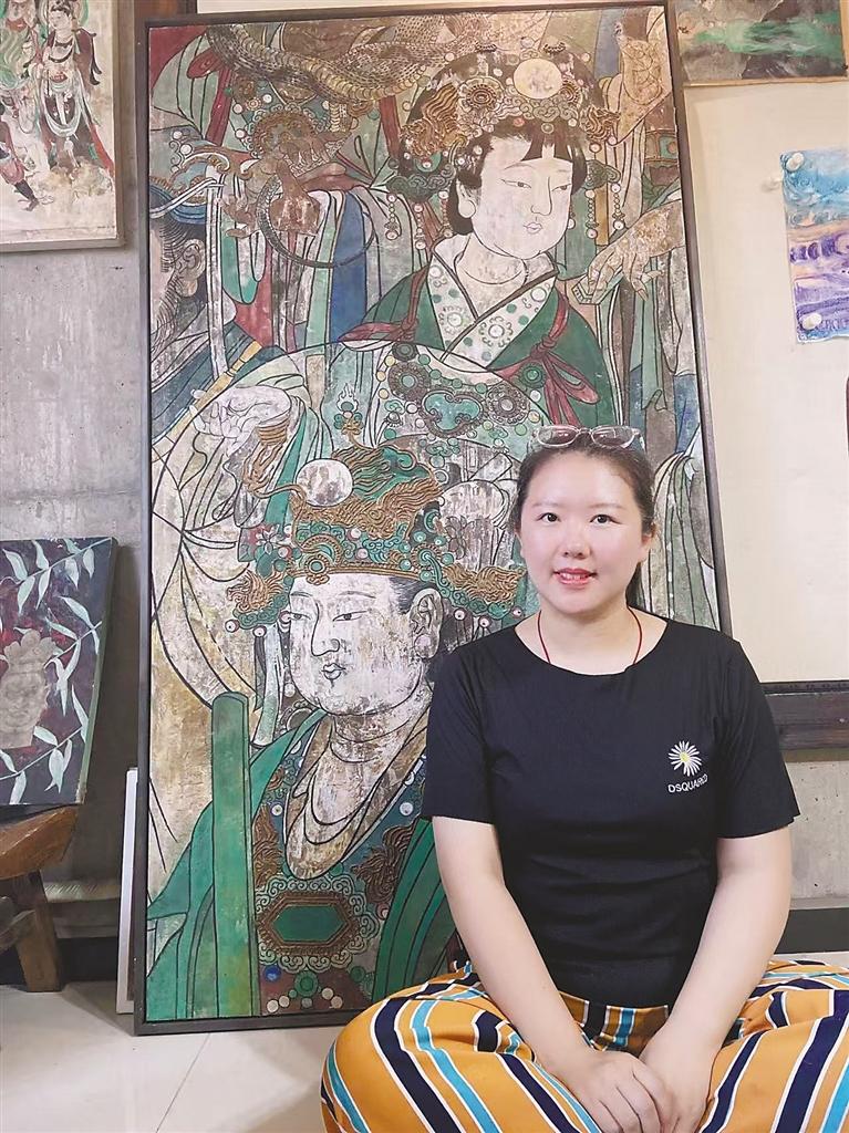 劉曉彤的靈感源于在考察研究時學(xué)習(xí)到的巖彩畫技法,她運用巖彩這一千年不變色的傳統(tǒng)工藝技法與古人“對話”,并在繪畫過程中通過對描繪畫面現(xiàn)狀的斑駁肌理感與賦彩,摹寫古代壁畫的現(xiàn)狀,傳承和感受古典美。