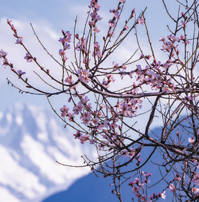盛開的桃花與遠(yuǎn)處的雪山相映成景。圖為記者徐馭堯攝