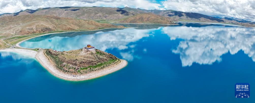 坐落于羊湖北岸一座半島上的日托寺(無人機拼接照片,7月22日攝)。新華社記者 聶毅 攝