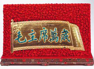 圖為金盾:毛主席萬歲。1951年5月,十世班禪大師敬獻毛澤東主席的禮品。金盾主體部分的五星紅旗是銅質(zhì)鍍金,珍珠鑲嵌旗面周圍,綠松石鑲嵌字體,右側藏文為“班禪額爾德尼敬獻”。圖片來源:民族文化宮 許娜攝